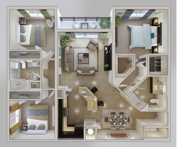 Mẫu 5: căn hộ 80m2 với thiết kế 3 phòng ngủ 3 góc