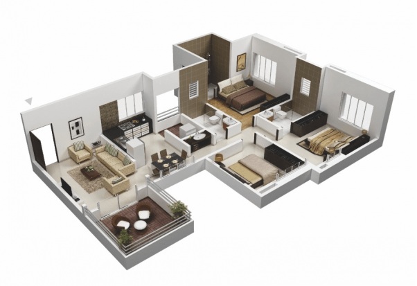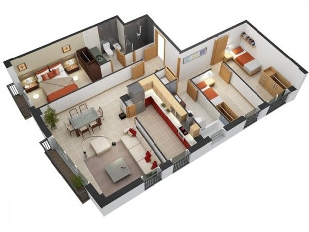 Thiết kế 3 phòng ngủ ở 3 góc của căn hộ, ở giữa là phòng khách và bếp. Đây có thể được coi là mẫu thiết kế căn hộ chung cư 80m2 độc đáo và ấn tượng nhất thời điểm bây giờ.