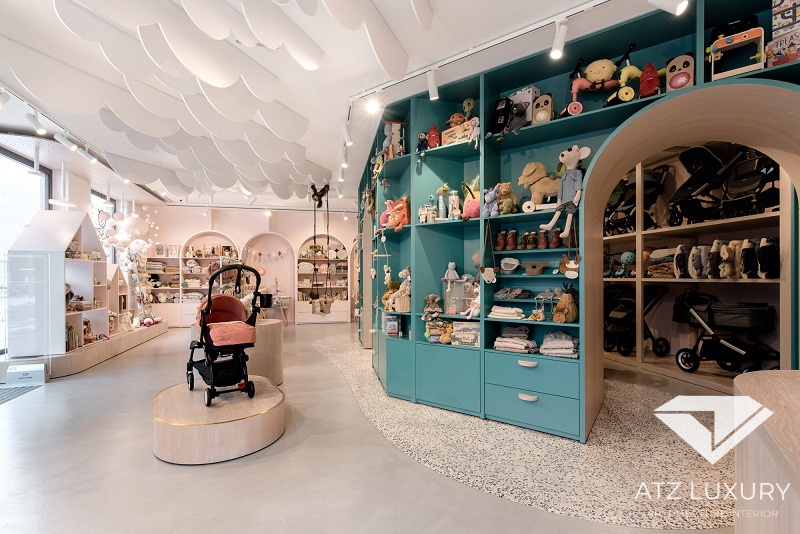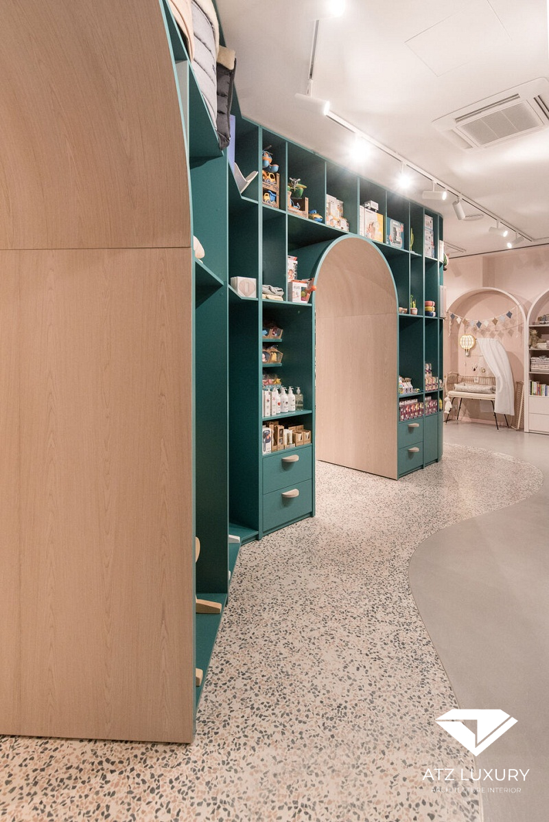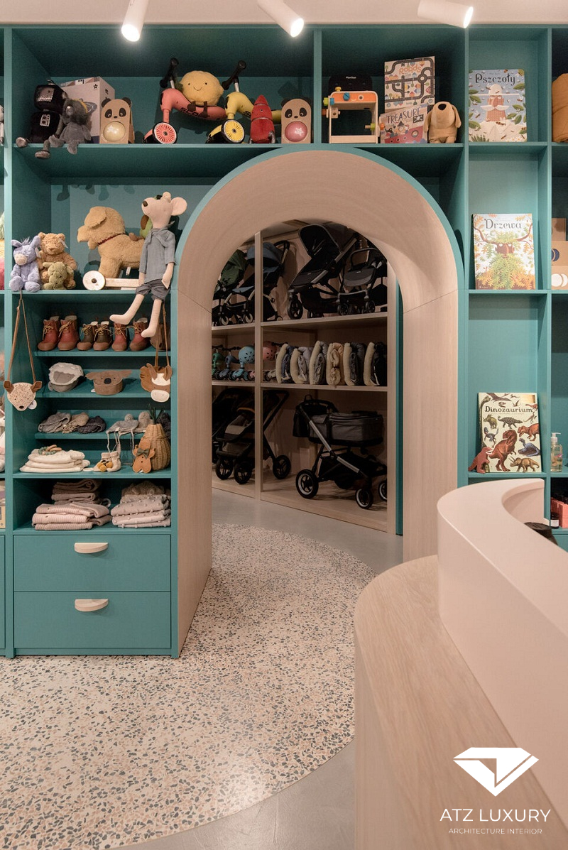 Việc thiết kế thêm những chiếc cửa vòm trên những chiếc kệ tủ như này khiến cửa hàng đò trẻ em giống như một mê cung nhiều lối đi vừa bí hiểm, lý thú, vừa hấp dẫn, kích thích sự tò mò, khám phá không chỉ của các bạn nhỏ mà còn cả các bậc phụ huynh.