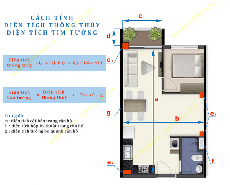 Công thức tính diện tích thông thủy căn hộ chung cư = ( Diện tích tường ngăn phòng + Diện tích ban công + Diện tích ở ) – ( Diện tích tường bao quanh căn hộ +Tường phân chia các căn hộ + Diện tích sàn có cột + Diện tích đặt hộp kỹ thuật)