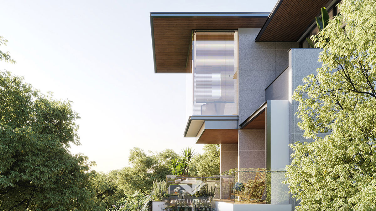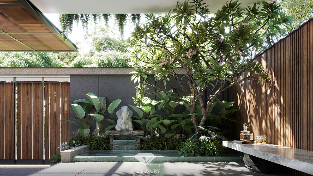 Khu vực tiểu cảnh trước cổng ngôi nhà, kiến trúc sư Đinh Thanh Tùng thiết kế một góc nhỏ rất chill có vách ngăn bằng gỗ ngăn cách với bên ngoài, khu vực này sẽ được sắp xếp với rất nhiều cây xanh cỡ lớn để đem đến cảm giác trong lành nhất, khi các thành viên vừa mới bước chân vào cổng nhà đã “giũ sạch” những lo toan, bận rộn và áp lực trong công việc để trở về nhà với trạng thái thư giãn, cảm giác sum vầy quây quần với gia đình khi tổ chức những bữa tiệc BBQ ngay dưới khoảng sân này.