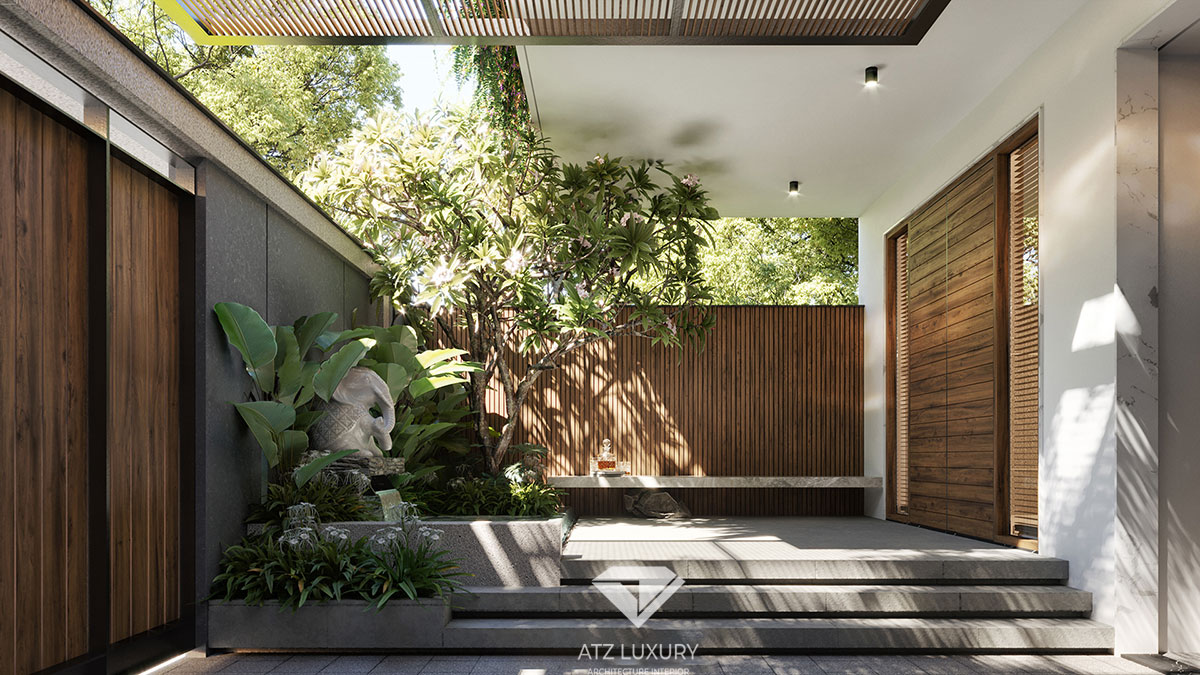 Khu vực tiểu cảnh trước cổng ngôi nhà, kiến trúc sư Đinh Thanh Tùng thiết kế một góc nhỏ rất chill có vách ngăn bằng gỗ ngăn cách với bên ngoài, khu vực này sẽ được sắp xếp với rất nhiều cây xanh cỡ lớn để đem đến cảm giác trong lành nhất, khi các thành viên vừa mới bước chân vào cổng nhà đã “giũ sạch” những lo toan, bận rộn và áp lực trong công việc để trở về nhà với trạng thái thư giãn, cảm giác sum vầy quây quần với gia đình khi tổ chức những bữa tiệc BBQ ngay dưới khoảng sân này.