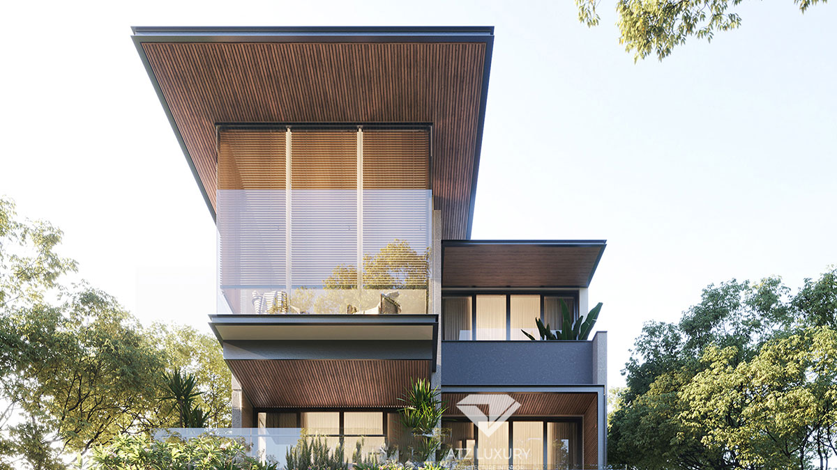 ATZ LUXURY và kiến trúc sư Đinh Thanh Tùng lựa chọn chất liệu ốp tường và vách ngăn bằng gỗ, tre rất thân thiện, “hoà làm một” với không gian xanh của thiết kế ngôi nhà.