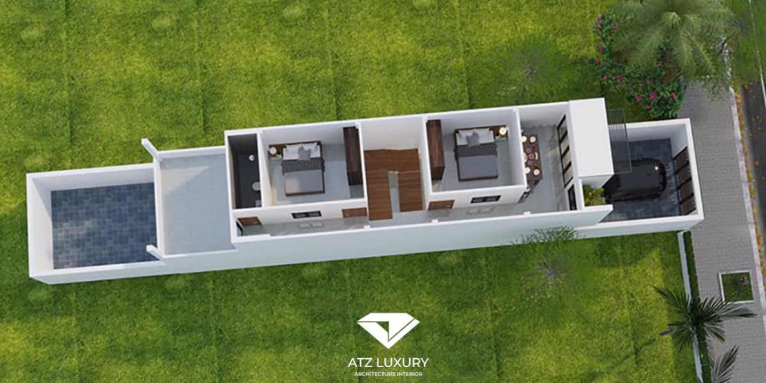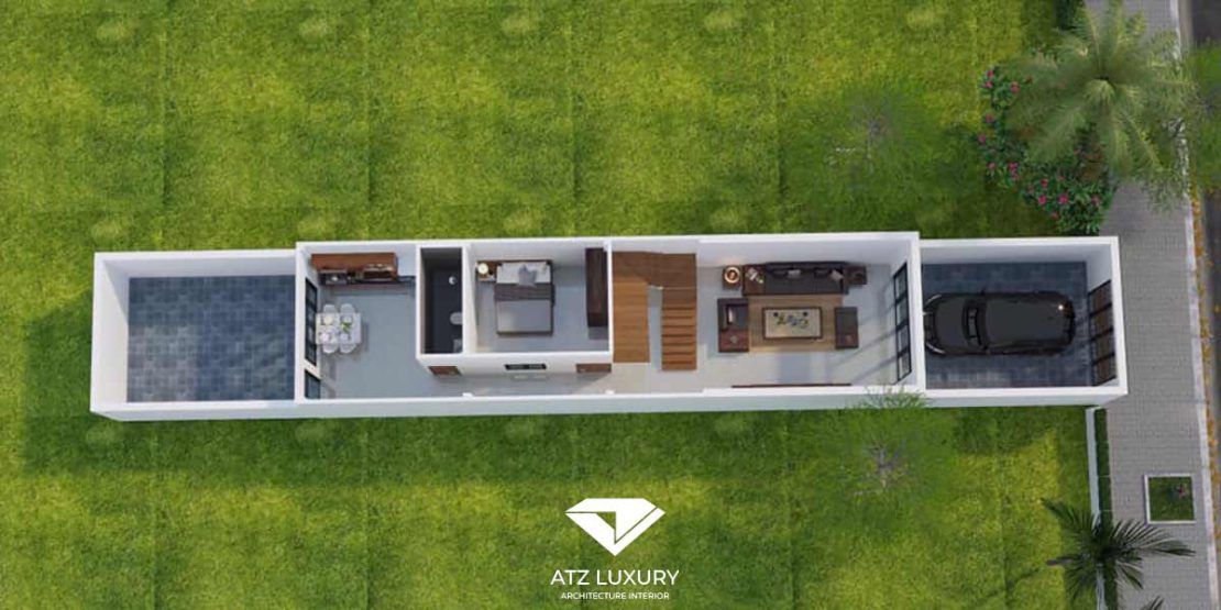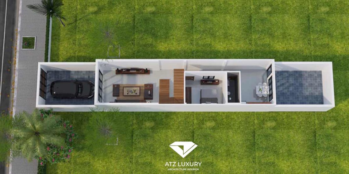 Theo những nội dung đã trao đổi với khách hàng, kiến trúc sư của ATZ LUXURY đã tiến hành lên bản vẽ chi tiết công năng của căn nhà phố 2 tầng 5x20m.
