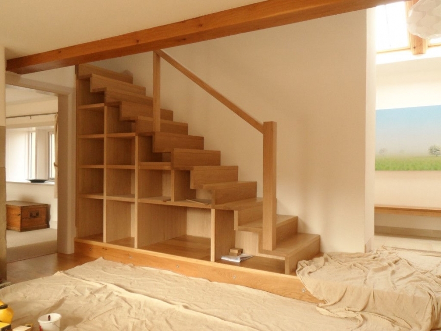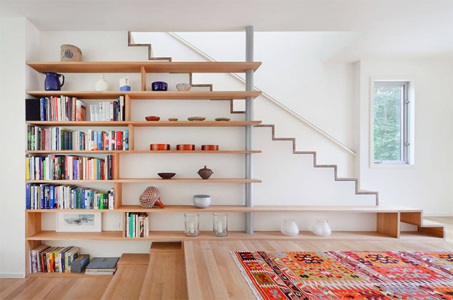 Mẫu 4: Kiểu cầu thang dưới đây đảm bảo được sự kết nối giữa tầng trên và tầng dưới. Nhưng khi nhìn vào, chúng ta có cảm giác đây là một chiếc kệ trang trí xinh xắn chứ không đơn thuần là một chiếc cầu thang cứng nhắc.