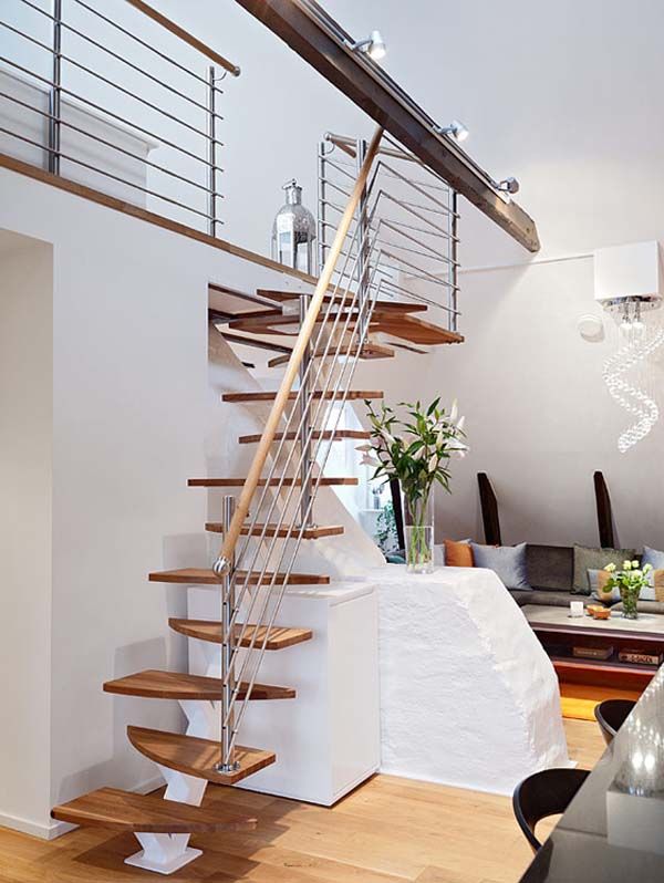 Trong đó, tiết kiệm diện tích bằng việc sử dụng cầu thang nhỏ tương đối khả thi, được nhiều người áp dụng. Cầu thang nhỏ ở đây cần đáp ứng được chiều ngang đủ để lên xuống, đảm bảo được sự chắc chắn và đề cao tính thẩm mỹ.