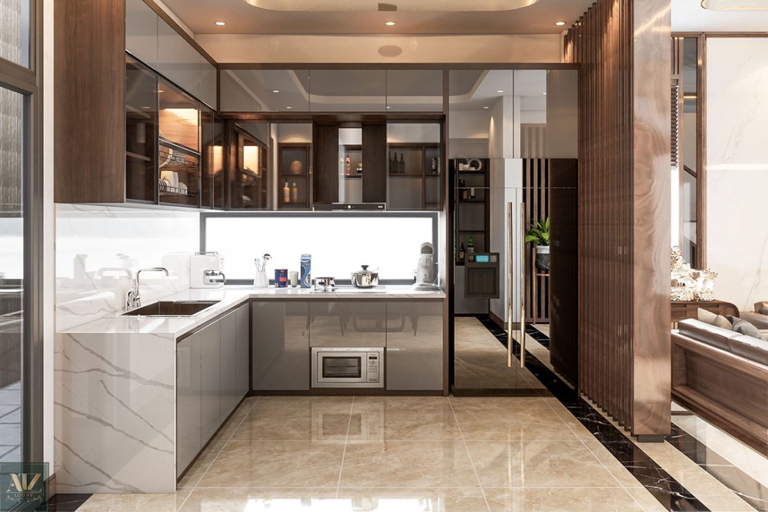 Phòng bếp được sử dụng tủ bếp bằng kính cao cấp, tranh treo tường, bàn bếp hài hòa, cho không gian bếp trở lên hoàn hảo không còn chật chội nữa.