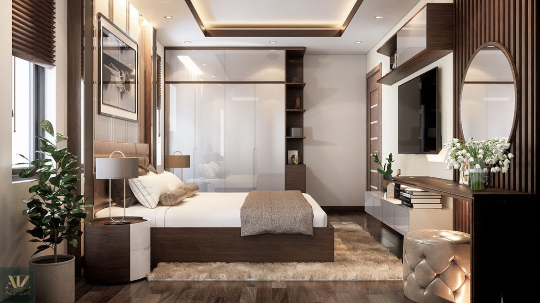 Phòng ngủ được thiết kế kết hợp giữa gỗ óc chó và hệ thống đèn chiếu sáng ấm áp như căn phòng cao cấp trong khách sạn hạng sang đầy lôi cuốn. Căn phòng có không gian thoải mái, ngăn nắp gọn gàng với những mẫu tủ giường, kệ thông minh, hiện đại.