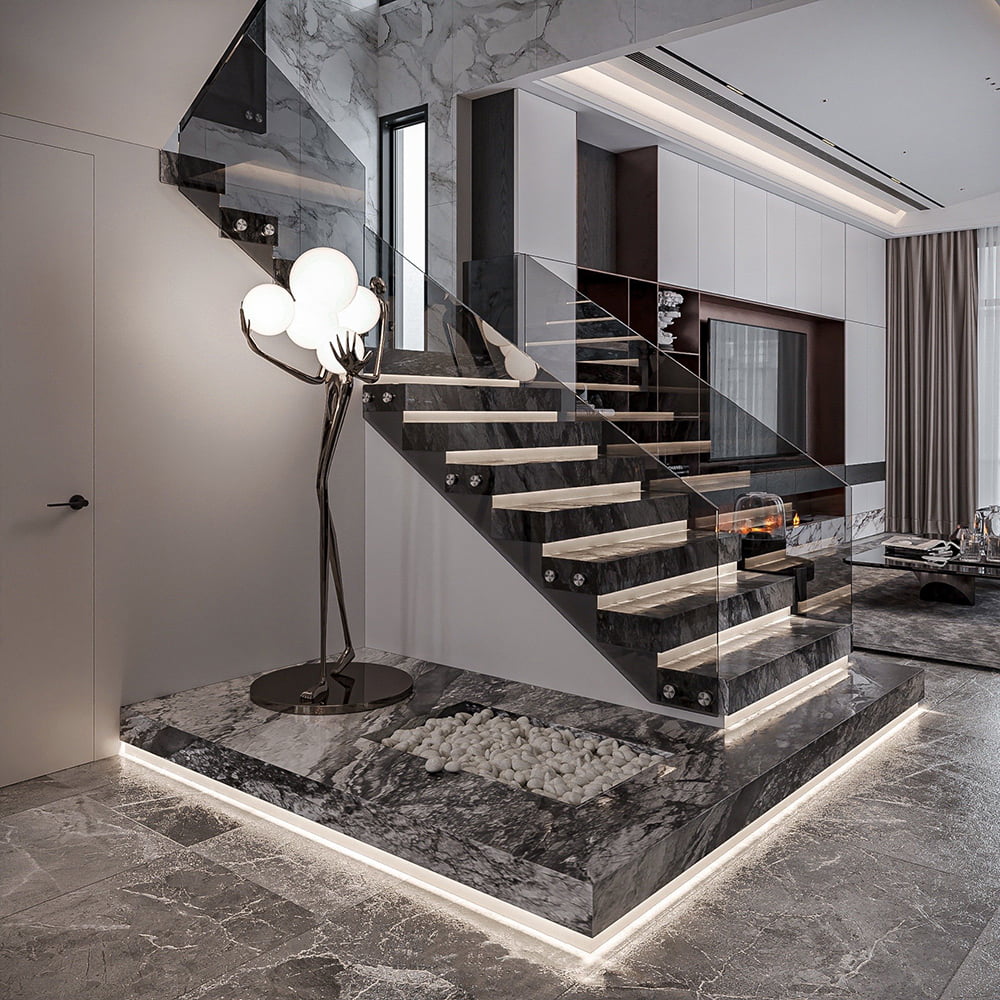 Cầu thang là yếu tố kiến trúc quan trọng kết nối hai tầng. Thiết kế cầu thang phải phù hợp về kích thước bậc, chiều cao và kiểu dáng (xoắn ốc, thẳng, chữ L) để đảm bảo an toàn, dễ đi lại và nâng cao giá trị thẩm mỹ cho tổng thể nội thất.