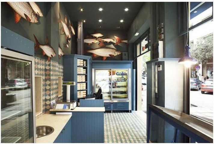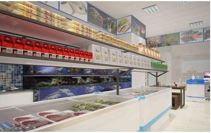 Một thiết kế quầy trưng bày hải sản có hình dáng lạ mắt và tiết kiệm không gian. Thiết kế đèn âm trần cùng với hoạ tiết dán tường sinh động, phù hợp tinh thần của mô hình kinh doanh cửa hàng hải sản.
