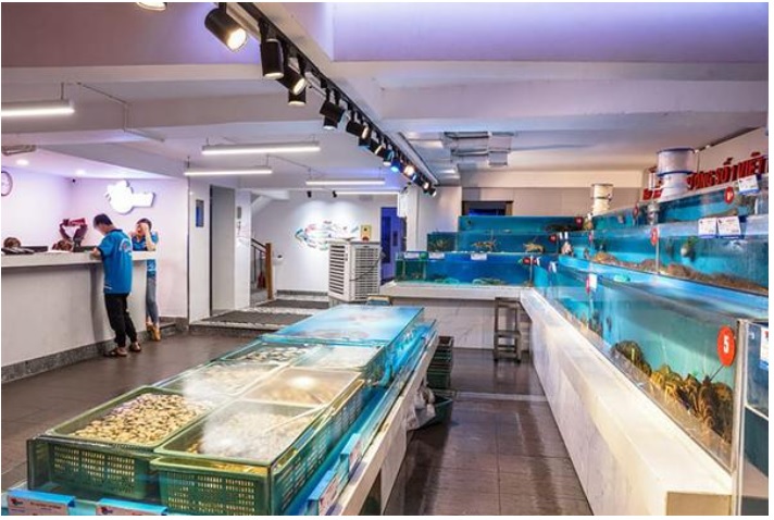 Khu vực trưng bày hải sản tươi sống cần được chăm chút cẩn thận nhất, đảm bảo đủ độ lạnh và không gian luôn sạch sẽ, thông thoáng. Nên thiết kế điều hoà và hệ thống hút mùi trong cửa hàng để hạn chế mùi tanh của hải sản.
