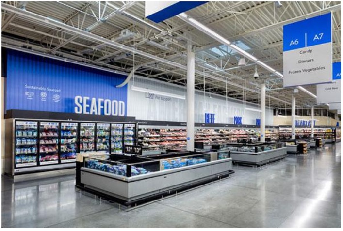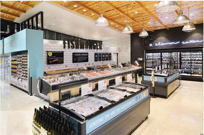 Kệ trưng bày đặt dọc theo vách tường mang đến không gian rộng rãi ở trung tâm, không gây ùn tắc vào những giờ cao điểm. Loại hải sản tươi sống và thực phẩm khô hay đóng hộp được sắp xếp riêng phù hợp yêu cầu bảo quản.