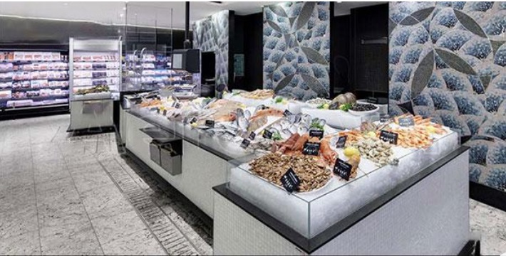 Hình ảnh mẫu thiết kế kinh doanh hải sản trong siêu thị hay trung tâm thương mại. Ưu điểm của thiết kế này là không gian rộng thông thoáng với hệ thống kệ tủ quy mô lớn . Nội thất trưng bày được nhập khẩu từ nước ngoài với khả năng giữ nhiệt tối ưu, đảm bảo độ tươi ngon tốt nhất cho sản phẩm.