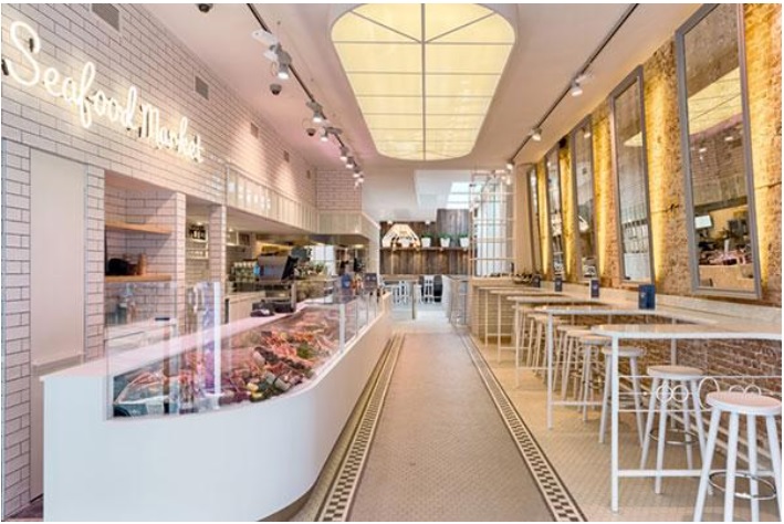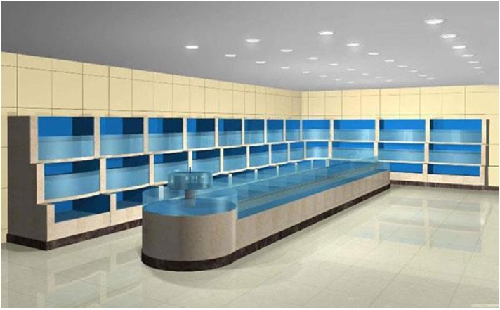 Thiết kế này có phương án trưng bày sản phẩm rất chuyên nghiệp. Kiến trúc sư sử dụng những bể cá trong suốt xếp song song rất đẹp mắt. Những loại hải sản đắt tiền và quý hiếm luôn được sắp xếp phía trong. Cách trưng bày này không chỉ giúp kích thích nhu cầu mà thậm chí khách hàng sẽ mua thêm nhiều sản phẩm khác.