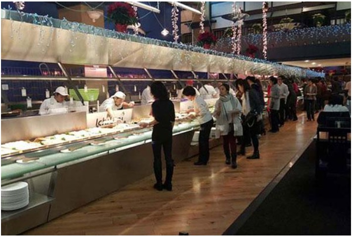 Thiết kế theo phong cách buffet đang phổ biến hiện nay. Bàn ăn và kệ trưng bày được lắp đặt có chiều cao hợp lý, phù hợp cho việc lựa chọn sản phẩm của khách hàng.