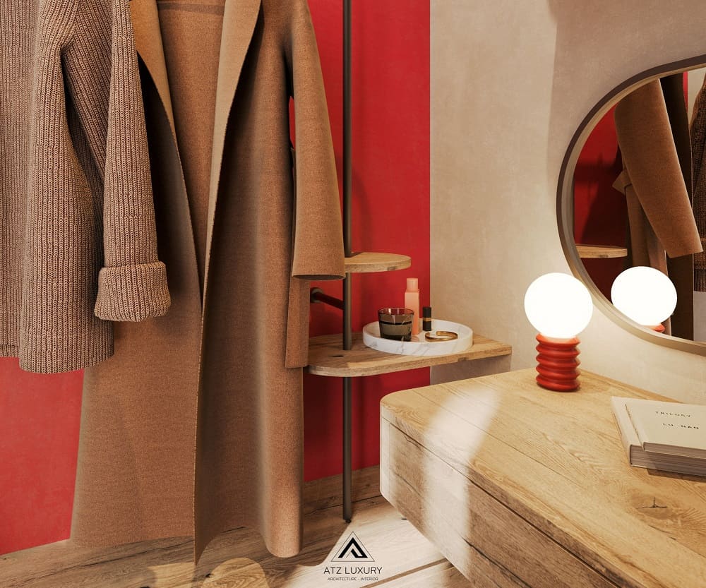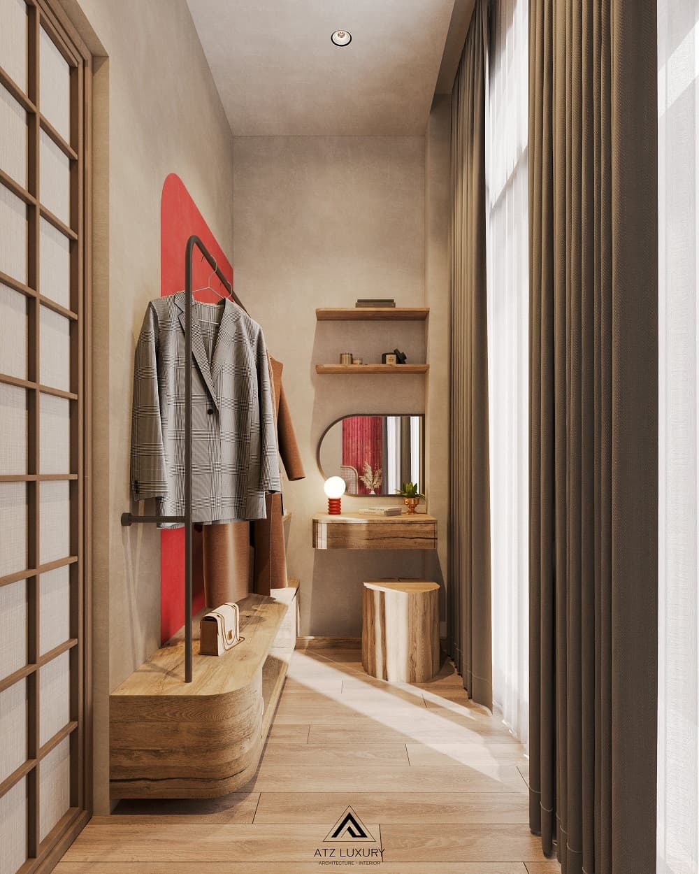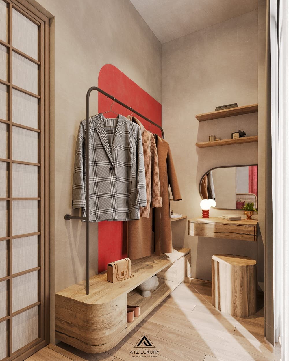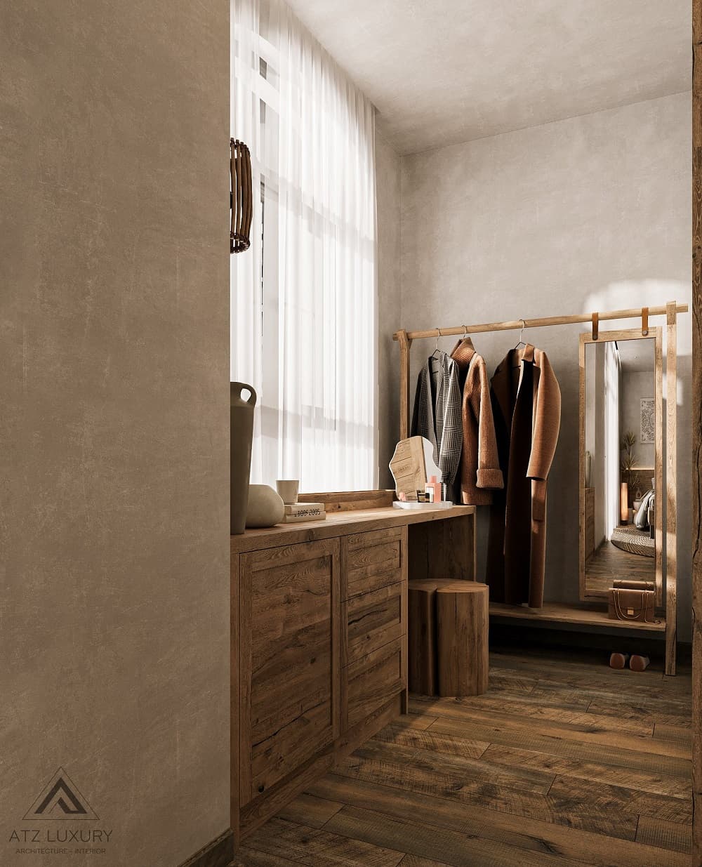 Chất liệu gỗ tiếp tục được KTS sử dụng trong thiết kế tủ kệ quần áo, bàn trang điểm và kệ decor.