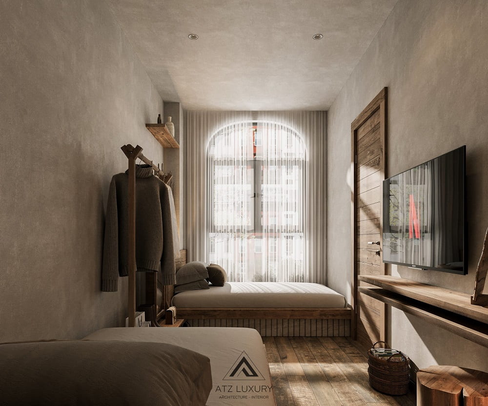 Phòng ngủ ở mẫu số 4 chủ yếu sử dụng màu sắc tự nhiên của các vật liệu và các gam màu trung tính nhẹ nhàng, tạo ra một không gian sống trang nhã và ấm áp. Thiết kế homestay này cũng sử dụng sự phối màu không quá tương phản, mang lại vẻ đẹp dịu dàng, trầm tĩnh và ổn định cho không gian nghỉ ngơi.