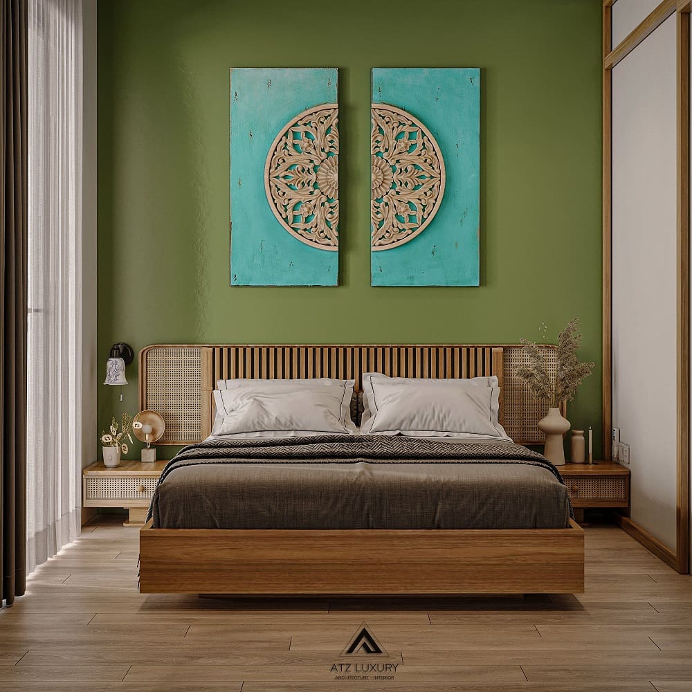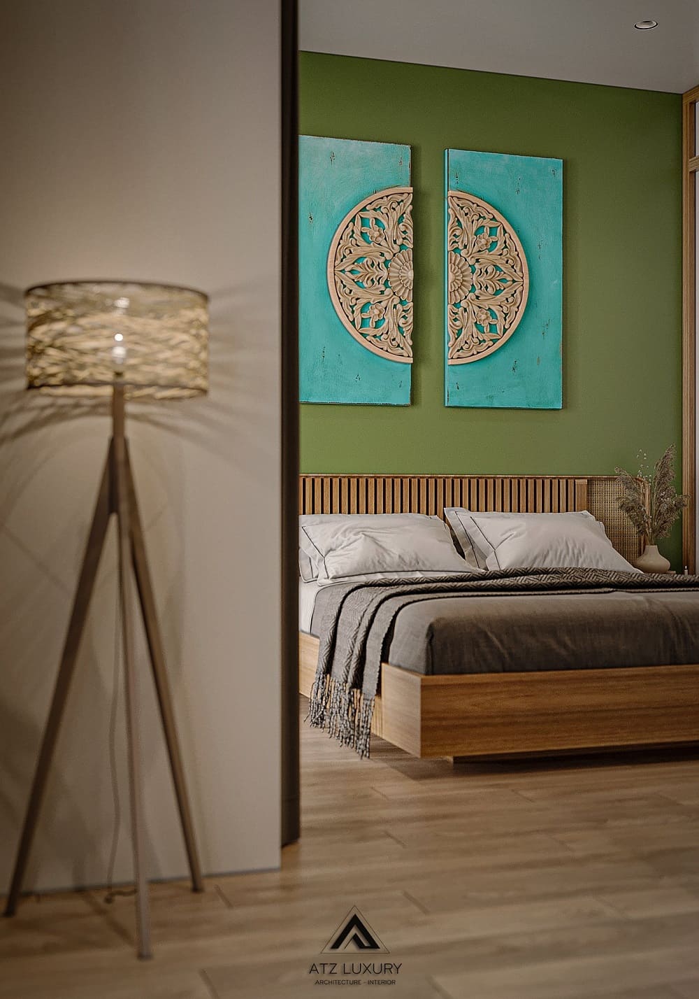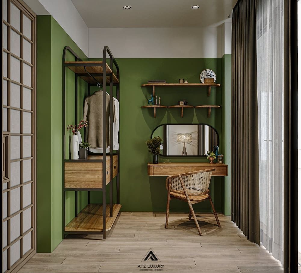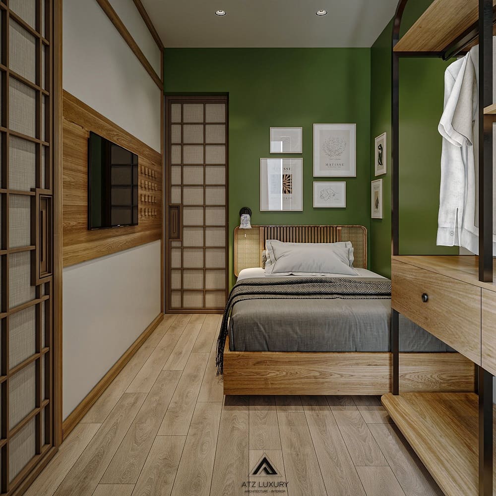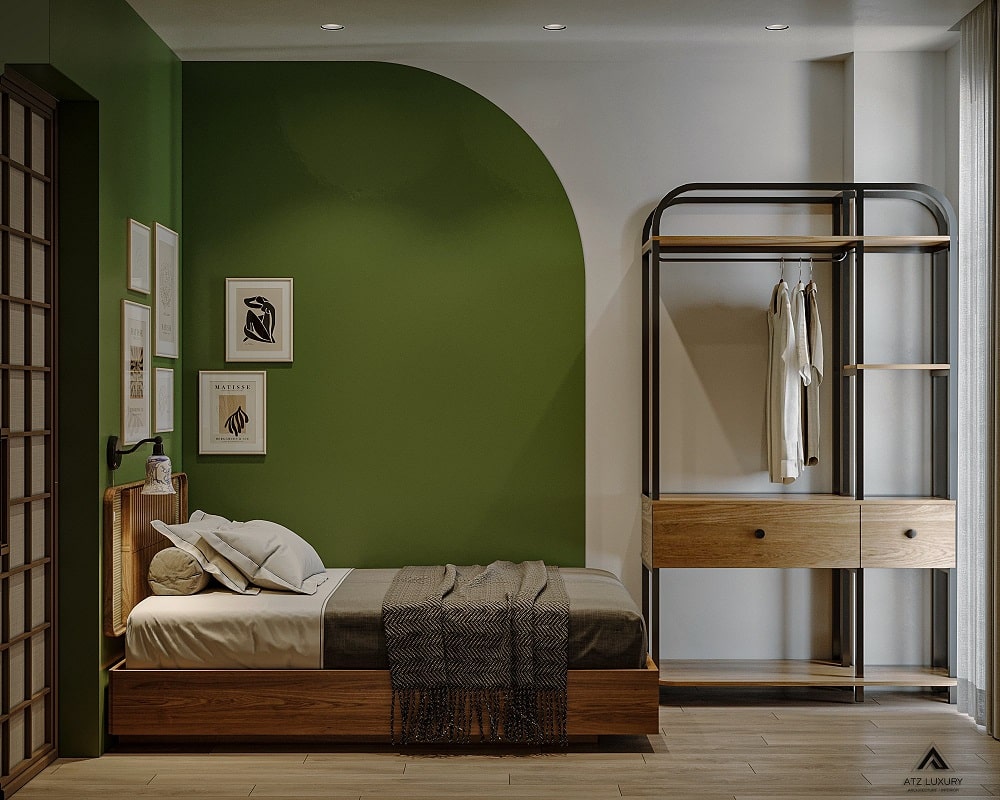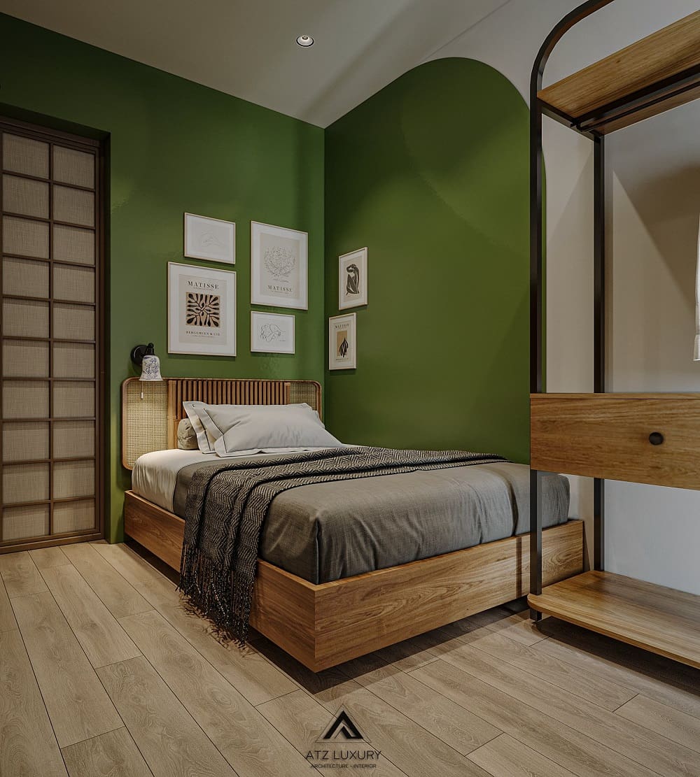 Ở mẫu 2, phòng ngủ được thiết kế với diện tích vừa phải, đủ để bố trí những món nội thất cơ bản như giường, tủ kệ lưu trữ. Màu xanh rêu kết hợp màu nâu gỗ tạo nên một không gian ấm áp.