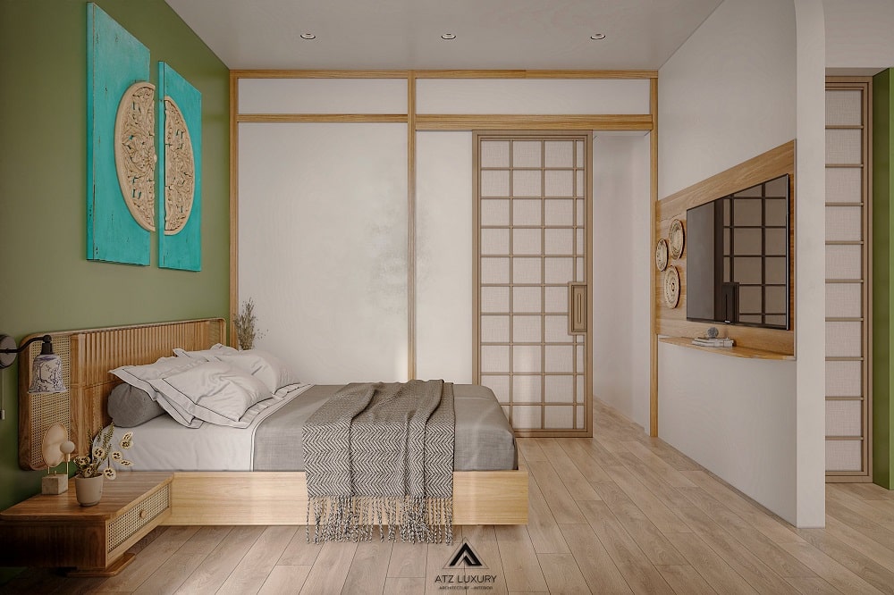 Phòng ngủ được thiết kế đơn giản và nhẹ nhàng với điểm nhấn là kệ tivi và kệ quần áo bằng gỗ. Bức tường màu xanh tạo nên không gian thoải mái và dễ chịu.
