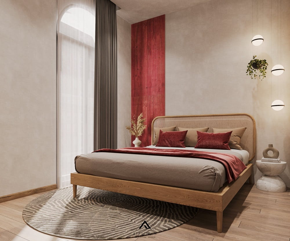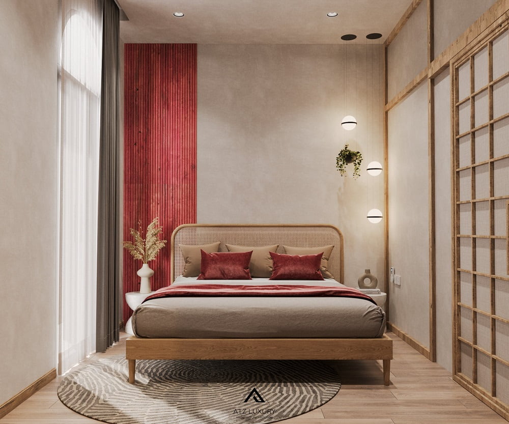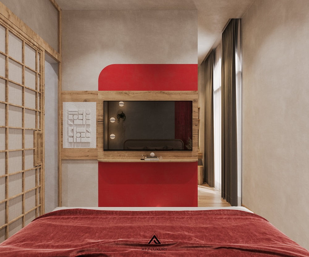 Về cơ bản, thiết kế nội thất của các phòng ngủ trong căn hộ homestay đều giống nhau. Tuy nhiên, kiến trúc sư của ATZ LUXURY đã sử dụng khéo léo các tông màu để tạo nên sự độc đáo và riêng biệt cho từng phòng. Nếu mẫu 2 ghi dấu ấn với màu xanh rêu thì đến mẫu 3 lại tạo ấn tượng với màu đỏ bắt mắt.