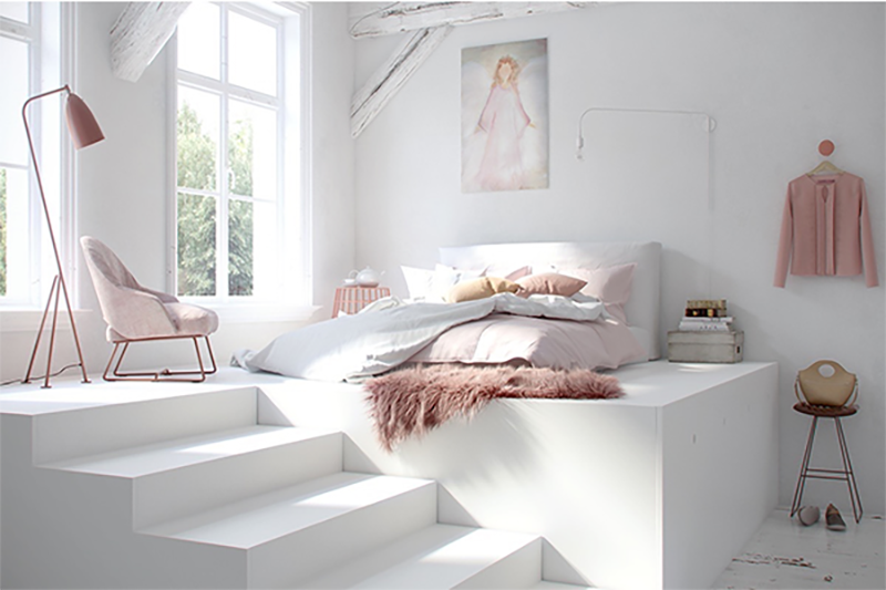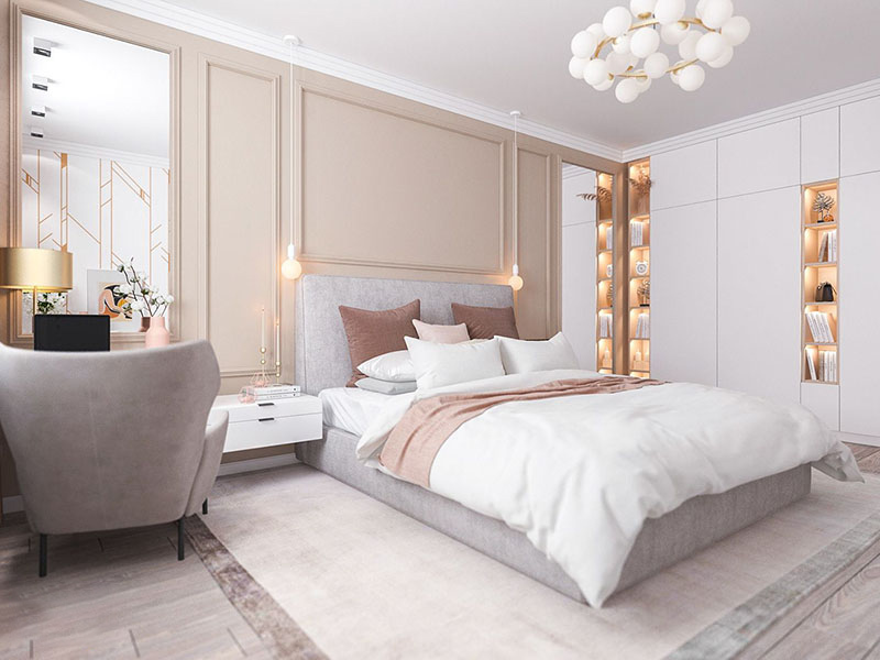 Tone màu trắng – hồng khiến cho căn phòng của bạn như được mở rộng thêm diện tích, đem lại sự trang nhã, lịch sự cho phòng ngủ của bạn