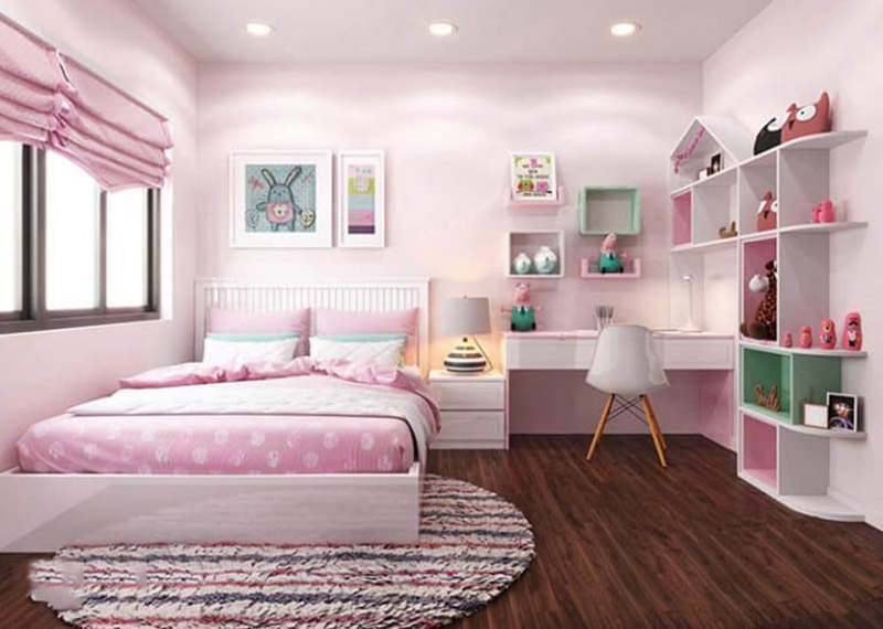 Màu hồng, tím khoai môn, trắng kết hợp với xanh nhẹ nhàng phong cách Hàn Quốc luôn là mẫu phòng ngủ làm đốn tim các bạn nữ,