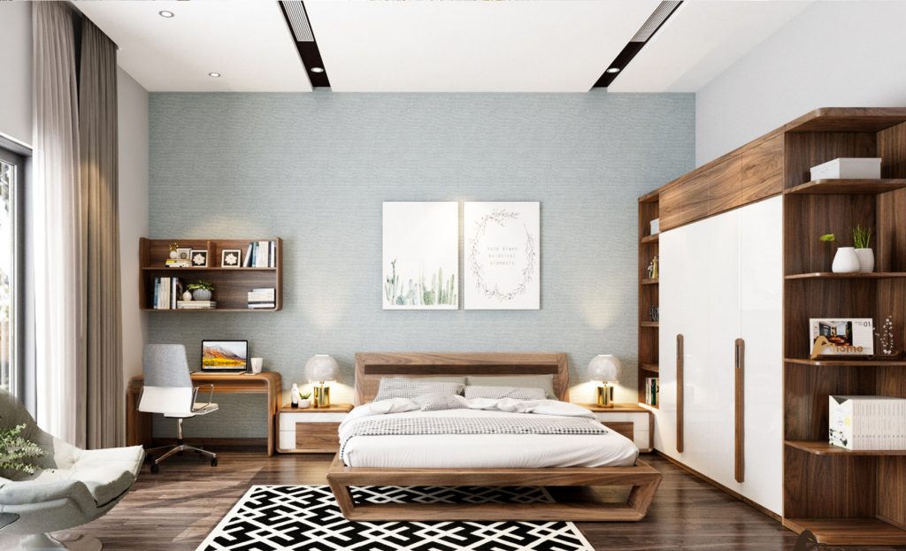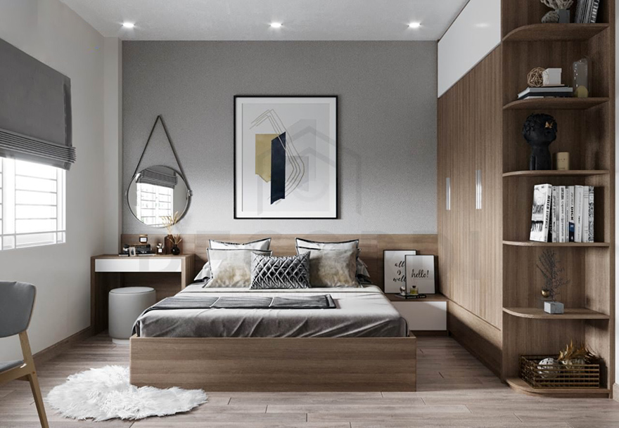 Với diện tích 9m2 phòng ngủ không phải to nhưng cũng không phải quá nhỏ, bạn có thể trang trí giường ngủ kết hợp thanh ngăn đầu giường, đặt bình hoa, đồng hồ, hoặc vài cuốn sách để đọc trước khi ngủ. Nên chọn bàn làm việc nhỏ, kết hợp tranh treo tường tạo sự tinh tế cho căn phòng. Phòng ngủ có diện tích 9m2 thường lựa chọn thiết kế theo phong cách hiện đại đơn giản, hướng đến công năng sử dụng là chủ yếu. Tùy từng sở thích của chủ đầu tư mà bạn có thể lựa chọn tone màu và bố trí saoo cho phù hợp nhất.