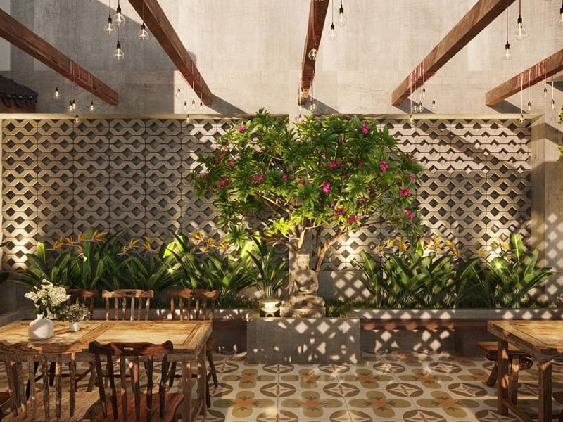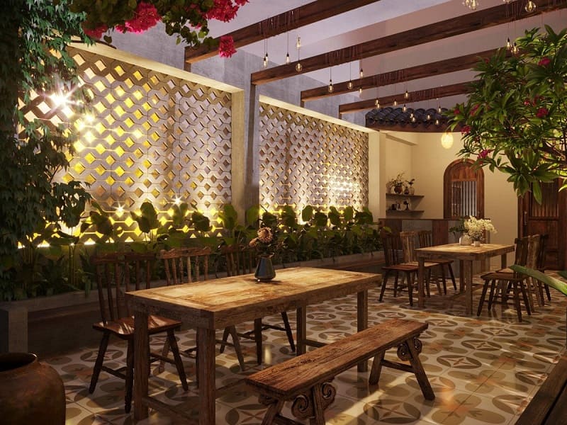 Với mẫu thiết kế này, khách hàng sẽ được trải nghiệm không gian mang đậm nét đẹp của làng quê Việt Nam với những hình ảnh quen thuộc như tường gạch, cây hoa đại đỏ, nhà mái ngói,… Thiết kế độc đáo này tạo ra một không gian mát mẻ và hoài cổ.