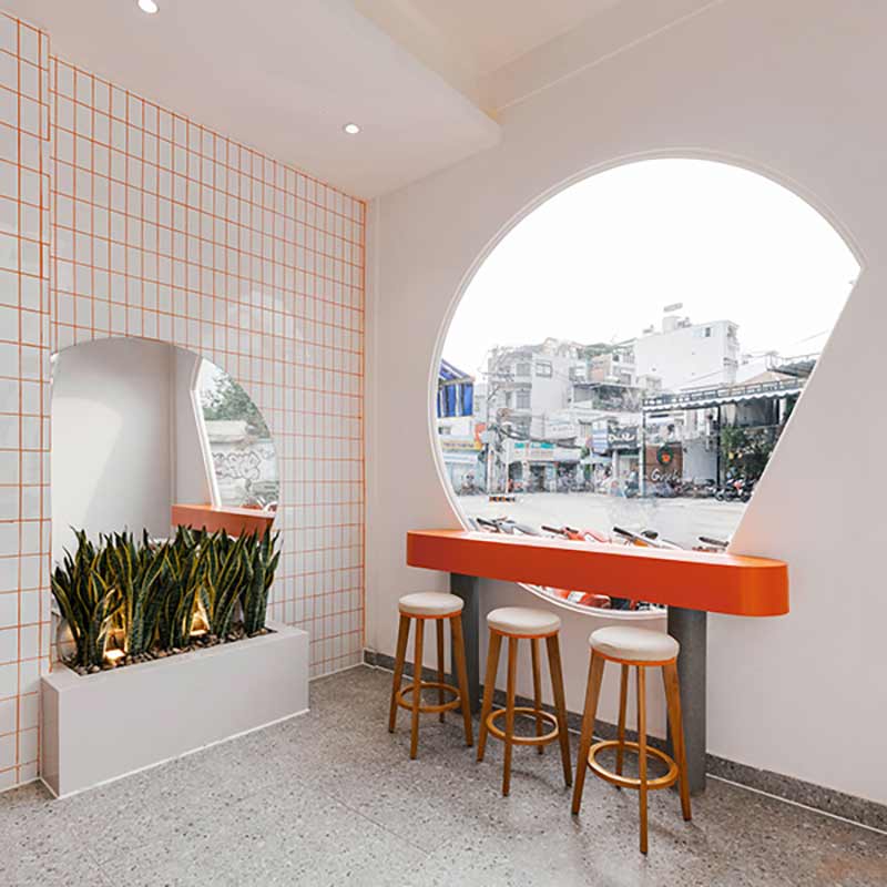 Sử dụng tường màu trắng, bàn gắn liền tường tạo thêm khoảng không cho quán.