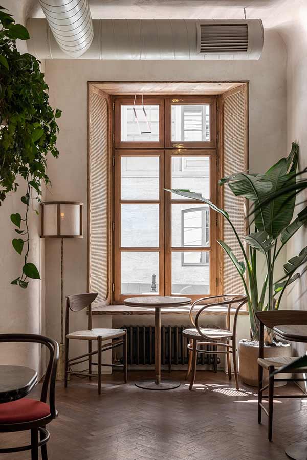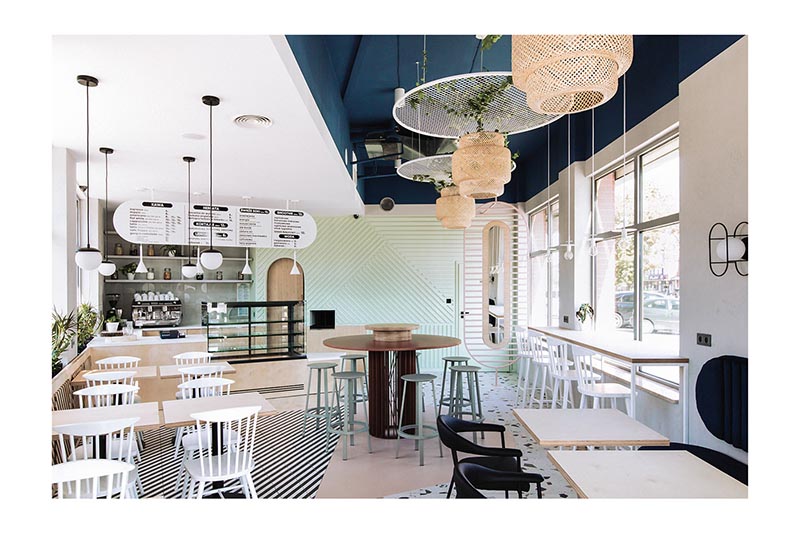 Sự kết hợp hoàn hảo giữa ánh sáng tự nhiên và ánh sáng nhân tạo giúp không gian quán vừa ấm áp vừa có sự tươi mới.