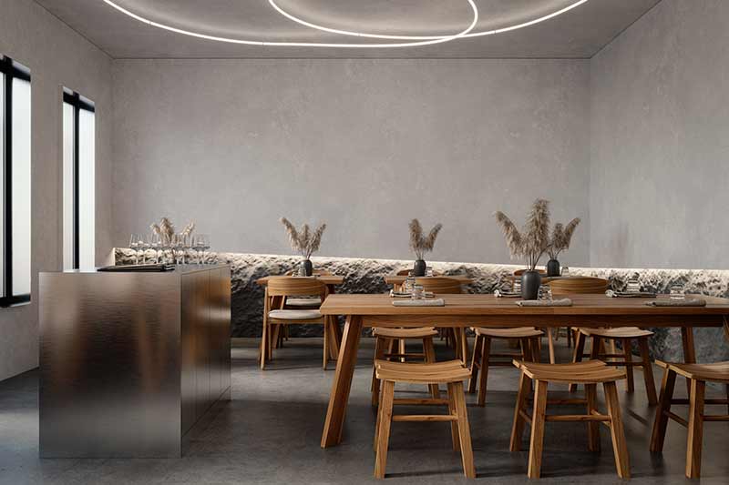 Sử dụng tường bê tông với màu bàn ghế sáng tạo điểm nhấn.