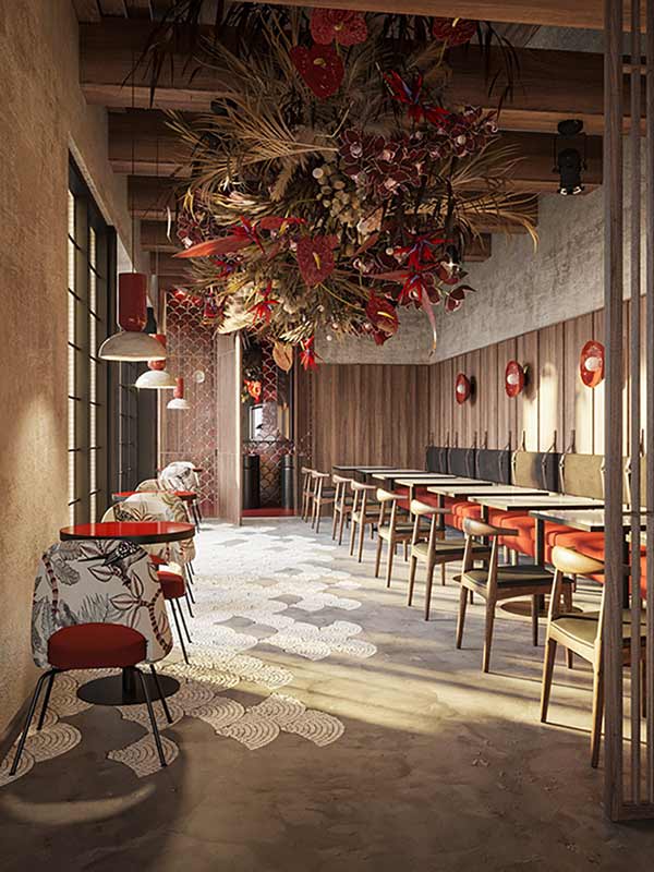 Sử dụng gam màu tương phản giữa bàn màu đỏ với tường gỗ, đá lát sàn nổi bật phong cách sang trọng.