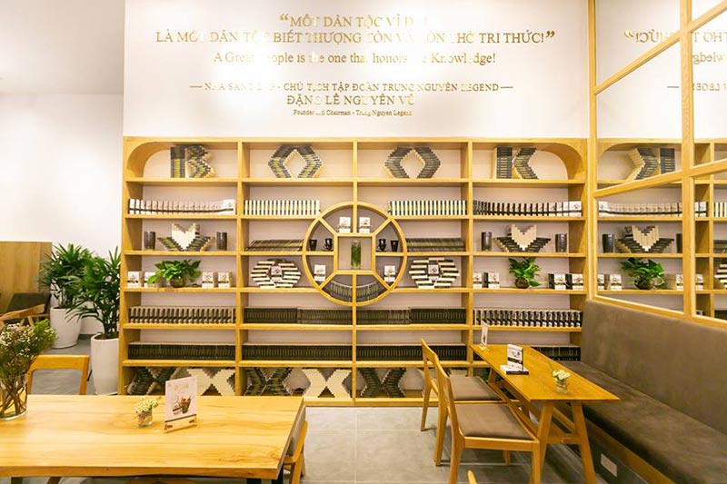 Hầu như, các cửa hàng hay chuỗi chi nhánh kinh doanh quán cafe trung nguyên nhượng quyền thương hiệu đều bố trí những chiếc tủ trang trí làm từ chất liệu gỗ với thiết kế đa dạng và mang đậm phong cách tối giản. Với tác dụng để trưng bày một số sản phẩm về cafe trung nguyên hoặc để nhiều cuốn sách hay liên quan đến nhiều lĩnh vực khác nhau cho khách hàng trải nghiệm.