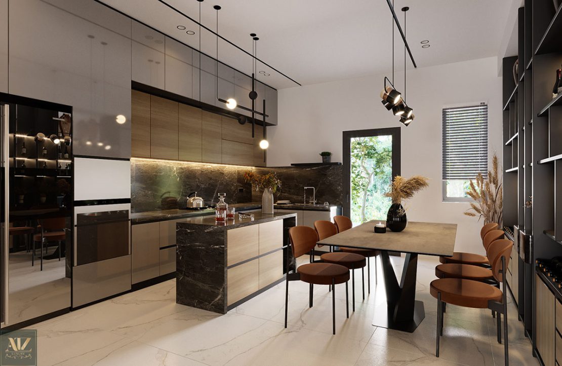 Thiết kế bếp và bàn ăn khá ấn tượng.
