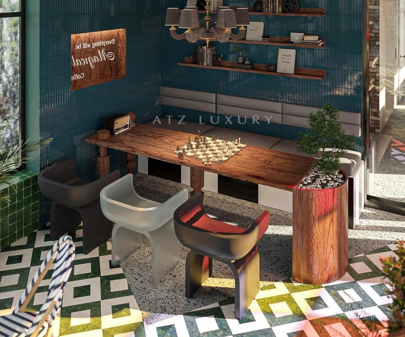 Sự hòa hợp với thiên nhiên là ưu tiên số 1 của đội ngũ kiến trúc sư ATZ LUXURY, chính vì vậy, nội thất trong quán cafe đa số đều được làm bằng chất liệu gỗ, kết hợp cùng những màu sắc mát mắt. Đem lại không gian thư giãn tuyệt vời cho khách hàng