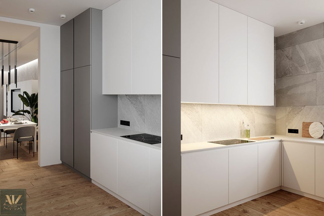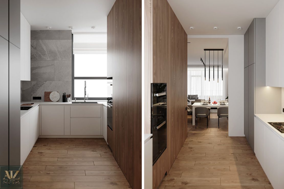 Ngay phía sau bàn ăn uống chính là khu vực phòng bếp. Với diện tích khá nhỏ, thiết kế bếp nấu dạng chữ U là giải pháp tối ưu và hiệu quả nhất. Tủ bếp có các ngăn kéo, ngăn tủ đa dạng kích cỡ đáp ứng mọi nhu cầu chứa vật dụng cần thiết của gia đình.