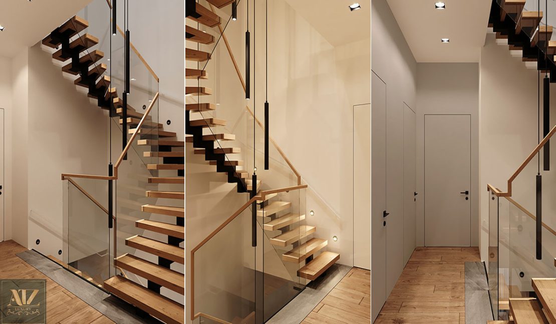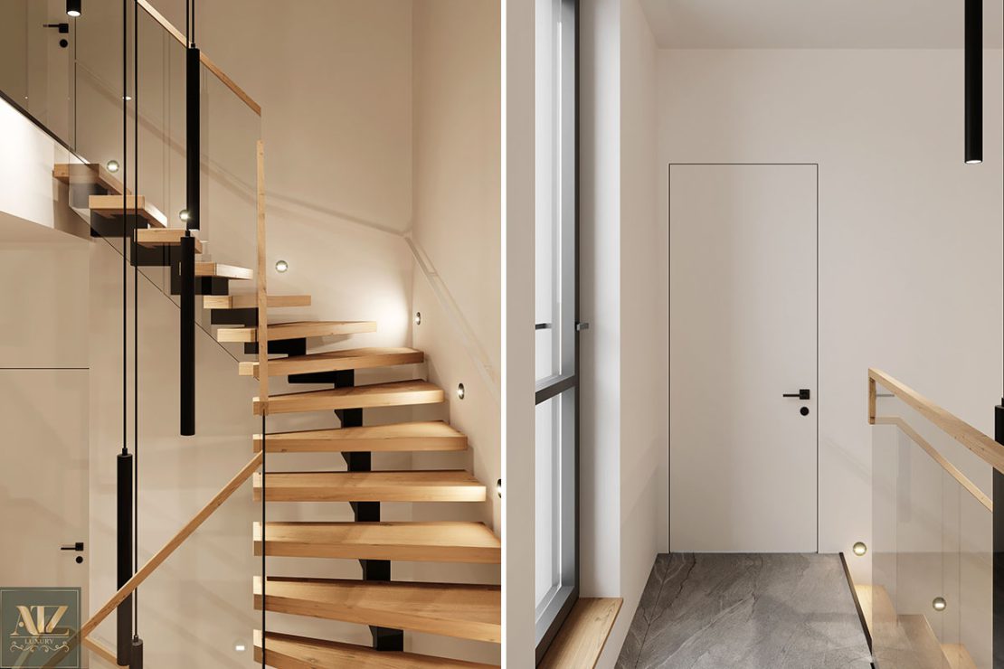 Hành lang bậc gỗ, lan can bằng kính cường lực nâng tầm tuyệt đối cho thẩm mỹ căn nhà. Lan can kính cường lực có rất nhiều ưu điểm: độ bền cao, đẹp mắt, chịu được nhiệt độ cao, dễ dàng vệ sinh.