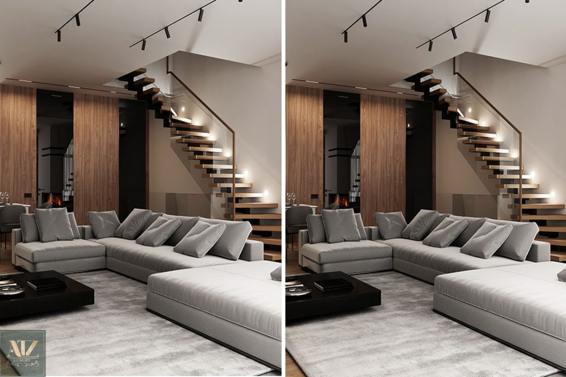 Phòng khách phong cách hiện đại với sự kết hợp hoàn hảo của hai tông màu là trắng – xám. Trên nền gạch có kết hợp thêm sàn gỗ keo tự dán vừa có tính thẩm mỹ mà chi phí cũng không cao.