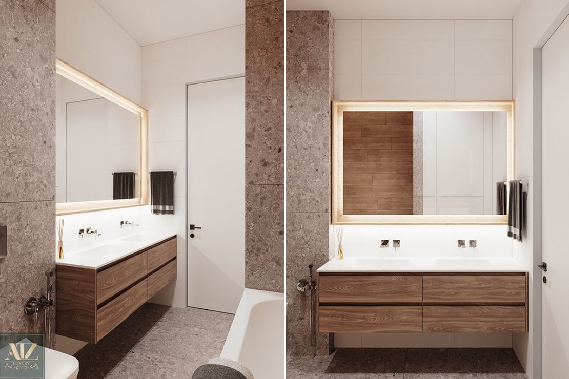 Nhà vệ sinh đơn giản chỉ cần bồn cầu và chậu rửa mặt liền tủ lavabo là đủ.