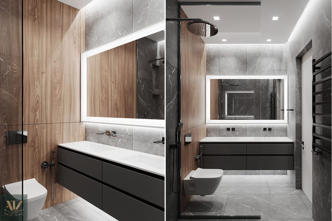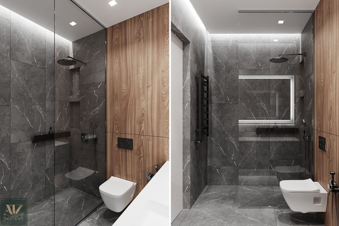 Chia thành 2 phần: khu nhà vệ sinh và buồng tắm đứng. Giữa 2 không gian ngăn cách bởi vách kính cường lực trong suốt, độ bền cao.