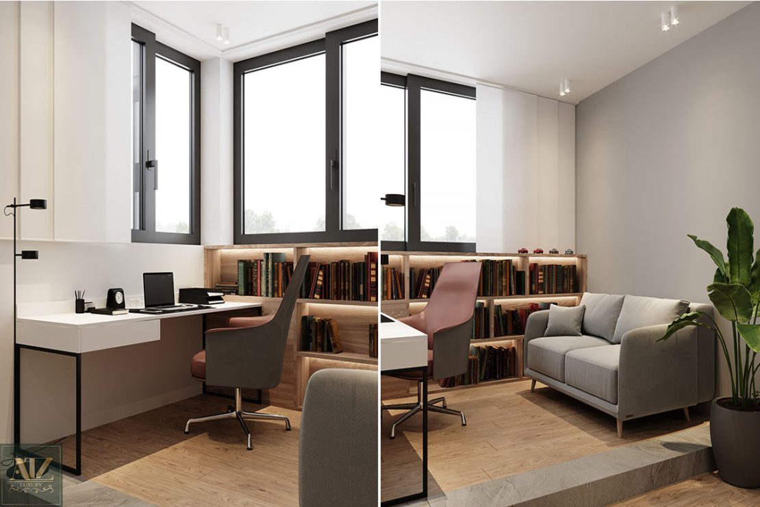 Bên cạnh bàn làm việc cần thiết, thì việc đặt thêm chiếc sofa hay chiếc đàn yêu thích của chủ gia đình là yếu tố không thể thiếu. Hai bên đều có cửa sổ thoáng đãng, đem đến một môi trường làm việc lí tưởng ngay tại căn nhà của gia đình.
