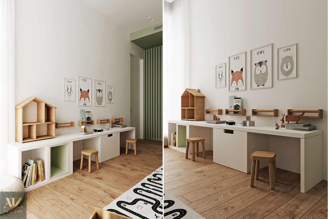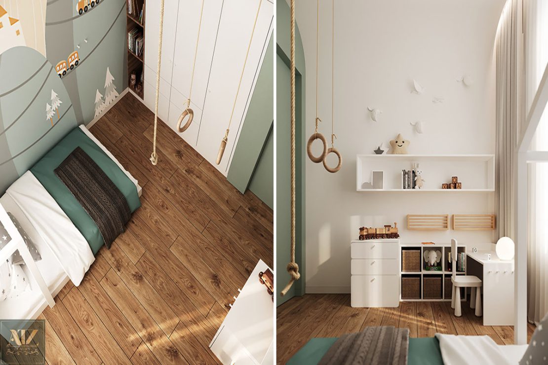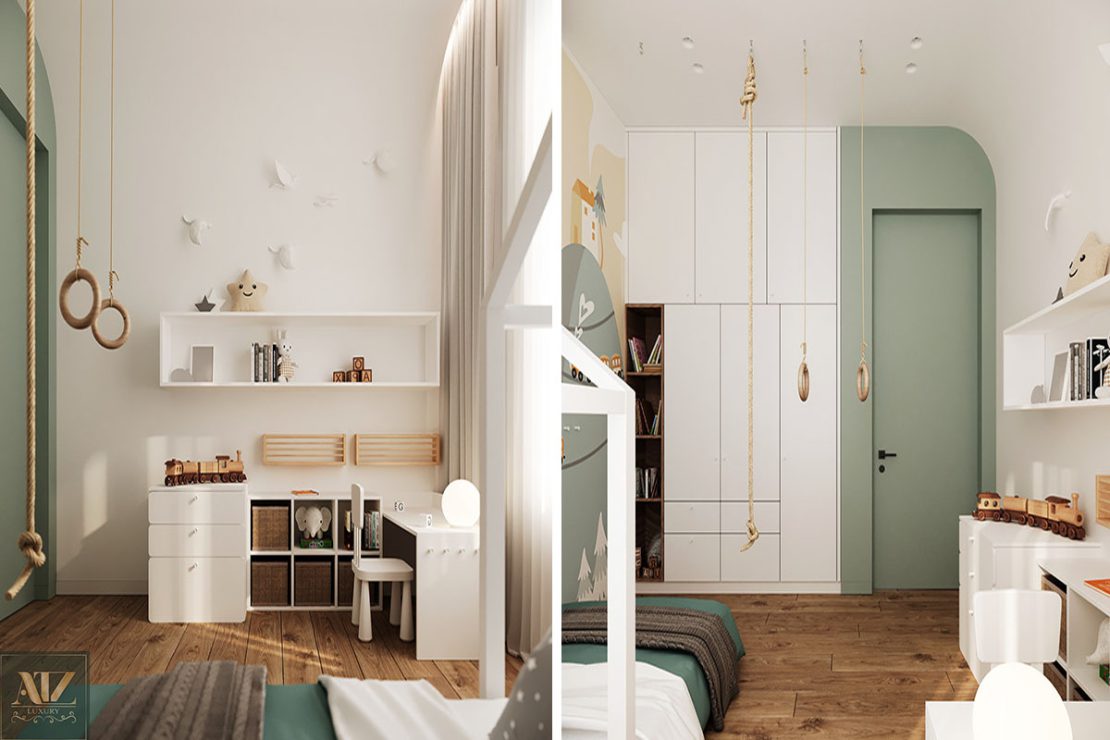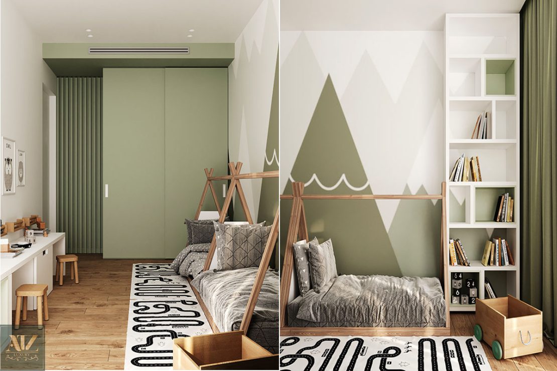 Trái ngược với phong cách phòng ngủ master, phòng ngủ nhỏ dành cho bé mang lại cảm giác sôi động, trẻ trung. Kết hợp màu trắng với các sắc xanh đa dạng tạo cảm giác hứng thú học hành, dễ chịu khi nghỉ ngơi cho trẻ.