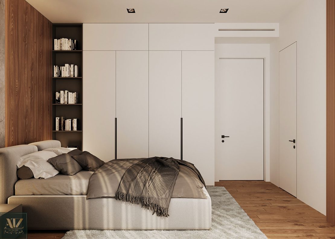 Phòng ngủ chính dành cho chủ gia đình được thiết kế đơn giản, tiện nghi. Giữa phòng đặt giường ngủ êm ái màu xám nhẹ nhàng, ấm áp. Bên cạnh đặt tủ quần áo kết hợp giá sách lớn khiến căn phòng trở lên gọn gàng, ngăn nắp.
