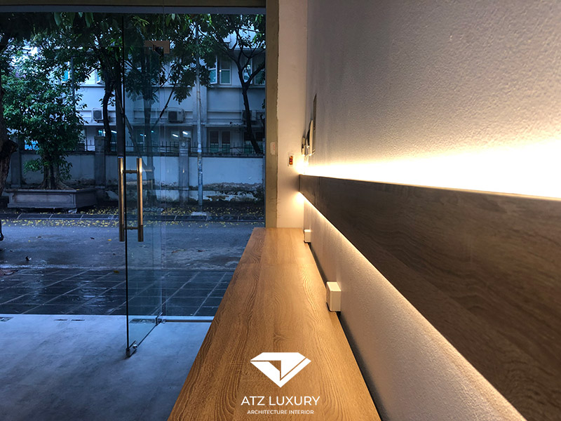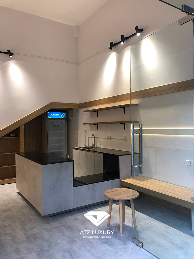 ATZ LUXURY cũng đề xuất xây dựng các mảng hình khối trong không gian khu vực quầy bar sẽ kết hợp hệ thống tủ âm tường có hình khối kéo dọc ra phía cửa quán cà phê, giúp tạo được chiều sâu cân đối cho quán. đồng thời tận dụng được tối đa không gian để Decor thêm các vật dụng trang trí và quầy bảo quản nguyên liệu pha chế.