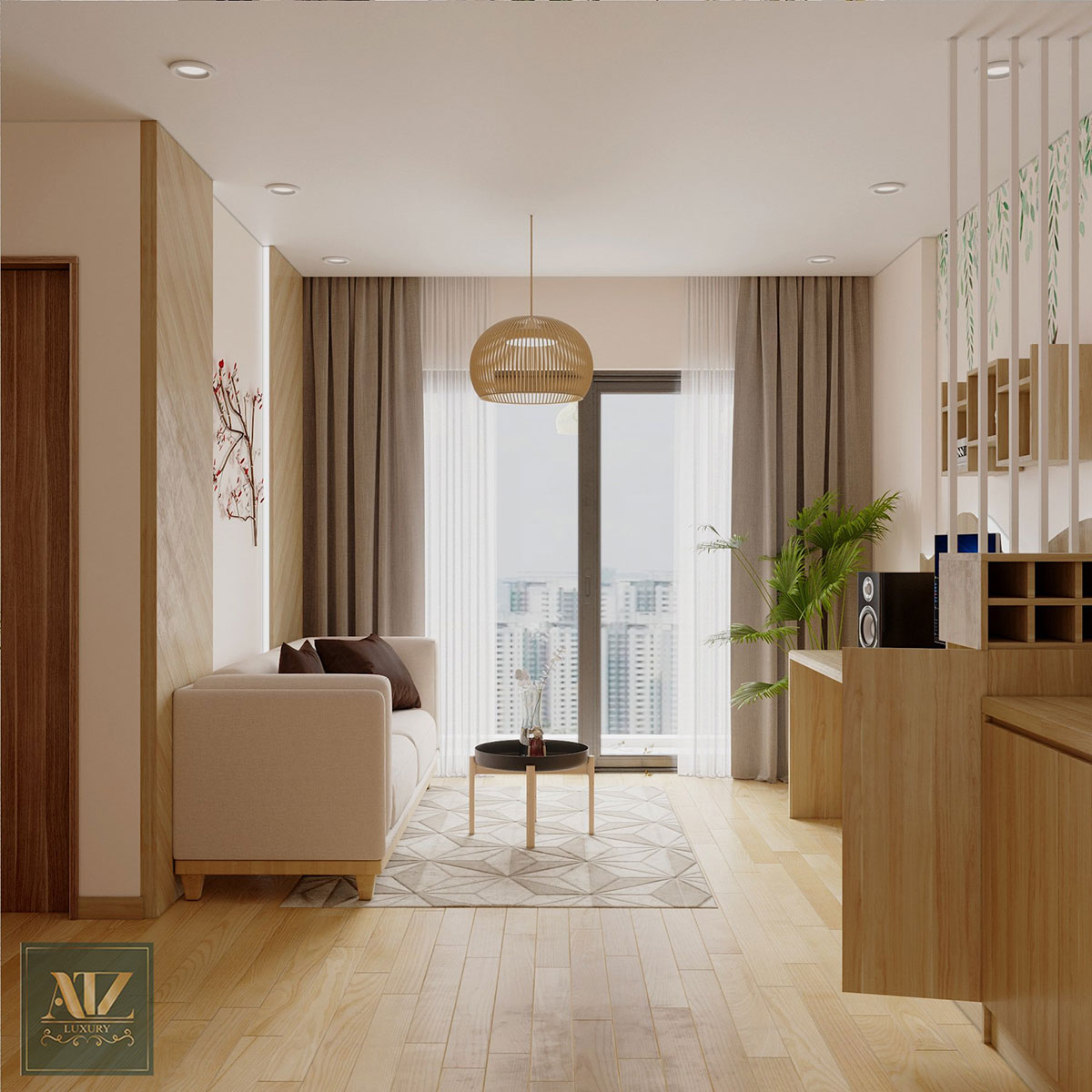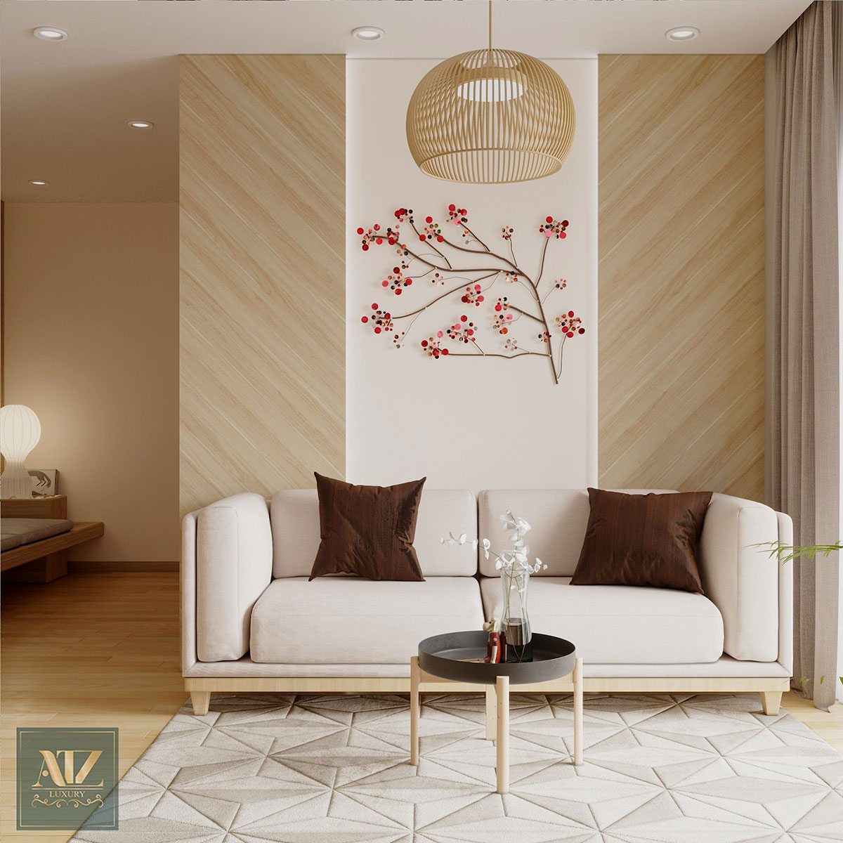 KTS. Phương Anh sau khi trao đổi với yêu cầu, mong muốn của anh Nhật đã nắm được mong muốn và ngân sách đầu tư dự tính của nhà anh Nhật đã lên ý tưởng thiết kế nội thất phòng khách chung cư cho nhà anh Nhật với tone màu chủ đạo là gỗ kết hợp trắng, phòng khách được thiết kế đẹp đơn giản tiết kiệm chi phí mà mang đậm những nét tinh hoa của văn hóa Nhật Bản, từ việc lựa chọn và sử dụng tranh hoa đào dưới mảng tường ngay sau bộ sofa, chiến đèn thả ngay vị trí trung tâm phong khách toát lên nét văn hóa đậm chất Nhật Bản.