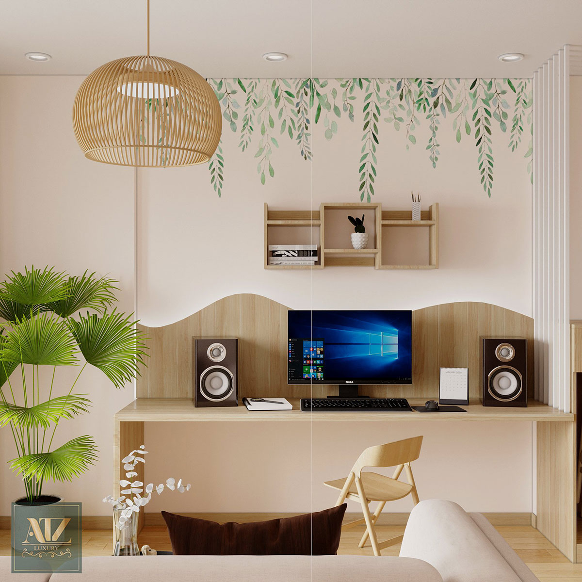 Phòng làm việc trong căn hộ 43m2 tại Vinsmart City của nhà anh Nhật cũng được khá chú trọng, phòng làm việc thiết kế thoải mái rộng rãi với những điểm nhấn, mang yếu tố thiên nhiên giúp khơi gợi nguồn cảm hứng làm việc cho anh rất tốt, mệnh của anh là mệnh hỏa rất hợp với màu xanh của thiên nhiên tượng trưng cho sự tăng trưởng hài hòa, tươi mát, mang đến nguôn cảm hứng làm việc bất tận cho gia chủ.