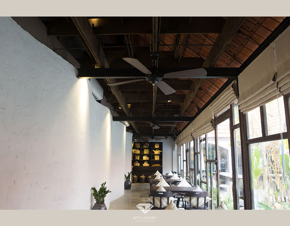Chị Khuyên chủ đầu tư rất muốn đưa thật nhiều chất liệu đồng quê vào nhà hàng mà chị coi như ngôi nhà tâm huyết của mình, vì vậy đội ngũ ATZ đã cùng bàn bạc với chị và thống nhất việc “giấu” các đồ điện tử hiện đại khỏi không gian nội thất đồng quê này. Đó là lí do máy lạnh được lắp đặt ở vị trí cao và khuất tầm nhìn, cũng như mang sắc trắng đơn giản chìm vào mảng tưởng uốn lượn nổi bật cũng là ý tưởng mà ATZ giới thiệu đến chị Khuyên.