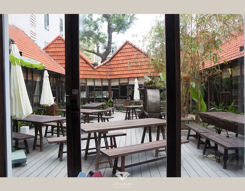 Không gian còn được mở rộng ra sân vườn lộng gió. Khu bàn ghế ngoài trời rực rõ với nguồn ánh sáng mặt trời và màu đỏ chói của ngói. Sàn gỗ và bộ bàn ghế gỗ rất đồng bộ với nhau. Các mái che di động được trang bị sẵn sàng để di chuyển đến các khu vực có nắng nhiều để che cho khách. Song song với phong cách thiết kế luôn là những cân nhắc về công năng và các phương án thay thế. Rèm cửa và mái che đồng bộ cũng là bộ đồ nội thất mà ATZ đã chuẩn bị cho nhà hàng của chị Khuyên.