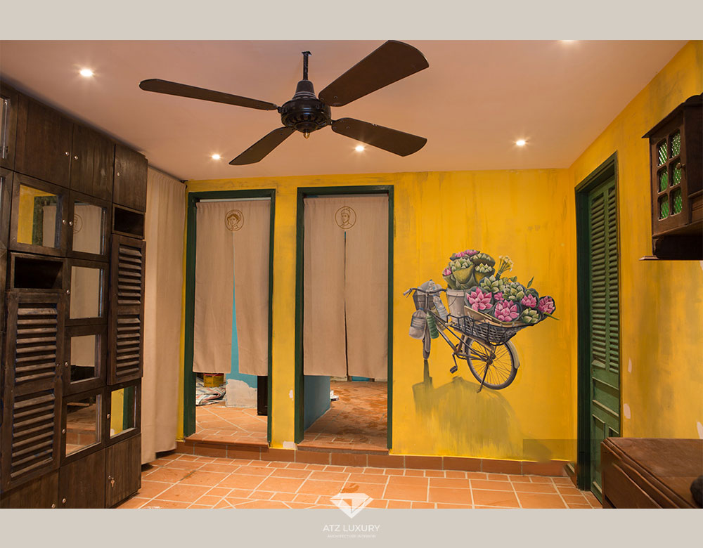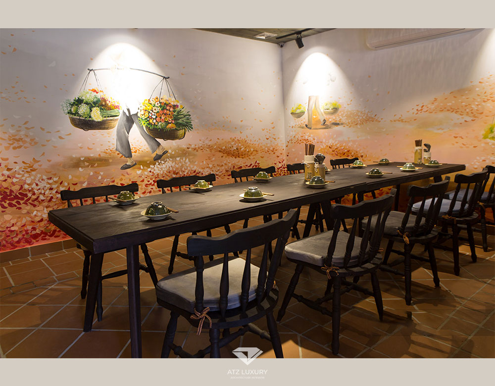 Để tăng xúc cảm cho thực khách khi bước chân vào không gian đồng nội yêu thích của mình, chị Khuyên đã lên ý tưởng về các bức tranh tri ân những hình ảnh người bán hàng rong được lãng mạn hóa. Và những bức tranh tường này là cách mà ATZ thể hiện ý tưởng của chị Khuyên.
