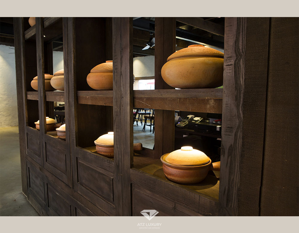 Đi dọc theo mảng tường uốn lượn sẽ đến khu vực rộng rãi hơn bên trong nhà hàng. Tiếp tục là tủ gỗ đồng bộ với không gian dùng để trưng bày đồ thủ công mỹ nghệ, lần này là các mẫu vật làm từ gốm. Tủ gỗ đặt để ở giữa không gian cũng vừa là để mọi người có thể nhìn ngắm đồ vật, vừa là một ý đồ phân chia không gian để thực khách có thêm sự riêng tư.